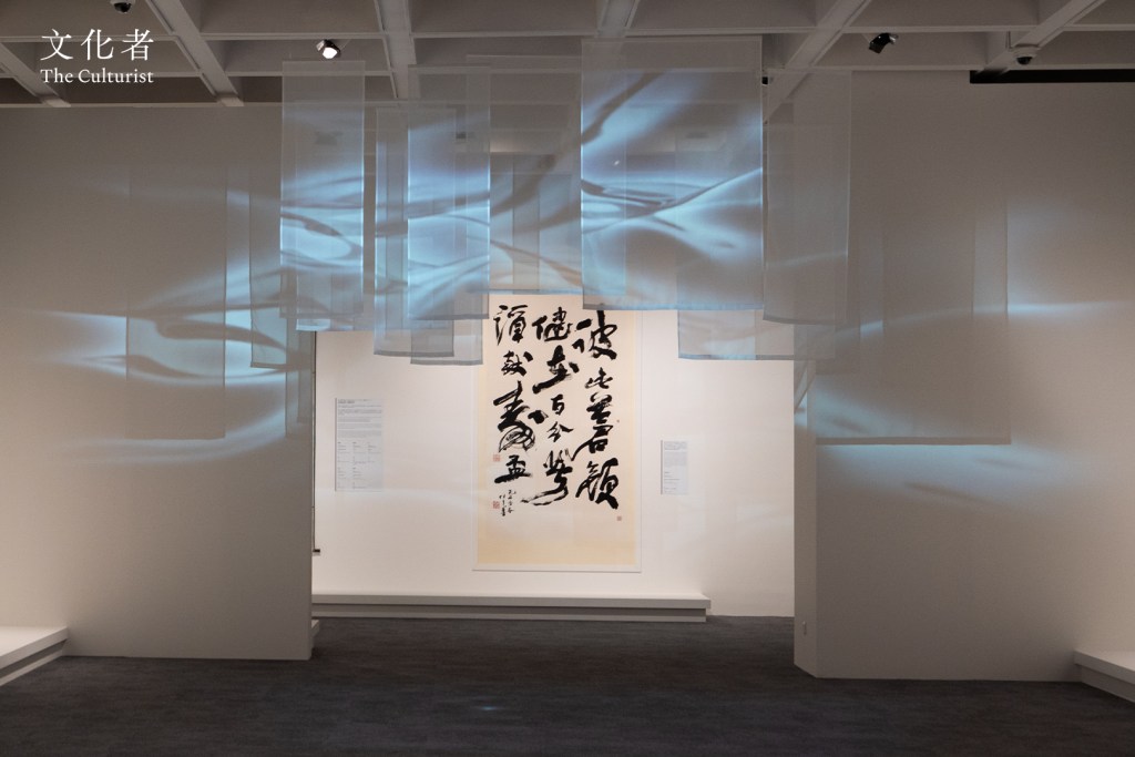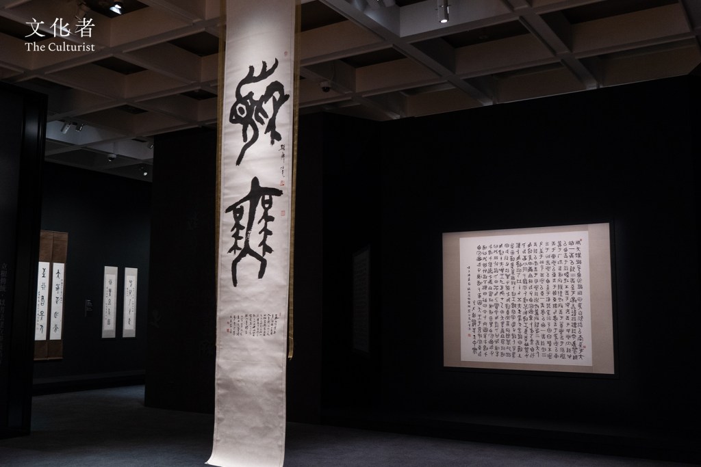 展覽的重點之作《行書「放懷」》達六米闊,簡單二字佔據大幅紙張,具有張揚飄逸之感。此為他晚年之作,筆劃剛勁有力,濃墨縱橫飛濺,更顯氣勢奔放,也展現出書家「吾行吾素」的灑脫個性,在張揚與內斂間找到自身的平衡。