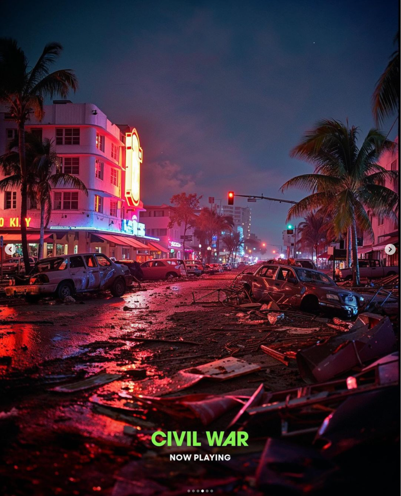由 Alex Garland 執導,獨立片廠A24歷來最大製作,耗資5,000美元製作的《美帝崩裂》(Civil War)創作了一個近未來世界,美國人撕裂成四大陣營,美國總統將華盛頓化身成威權政府,14個月不接受任何採訪。電影在美國開畫後票房不俗,評論有褒有貶,但A24最新發布的宣傳海報,卻惹來網民大肆批評。
