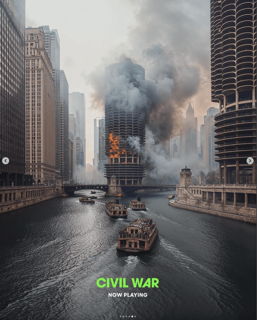 A24昨天發布的最新五張電影海報,都是內戰爆發後美國各處烽煙四起的景象:開幕不久,位於拉斯維加斯的 球體建築The Sphere一帶被轟成爛地,建築物已經破損;洛杉磯湖上有戰術快艇駛過⋯⋯等等。