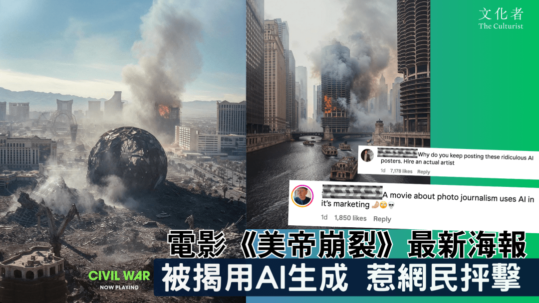這還是小問題,更猛烈的批評,是海報被眼利網民發現是用人工智能AI生成的。AI剛出現時人們都很好奇,但電影愛好者來說對電影公司運用AI替代創作人有很大的反對情緒,這五張海報的IG Post下,目前已寫滿了:「聘請真正的畫家吧!為何要用AI呢?」「用AI來做海報太尷尬了!」「一齣關於紀實攝影的電影,竟然用AI來做宣傳海報!」等評語。