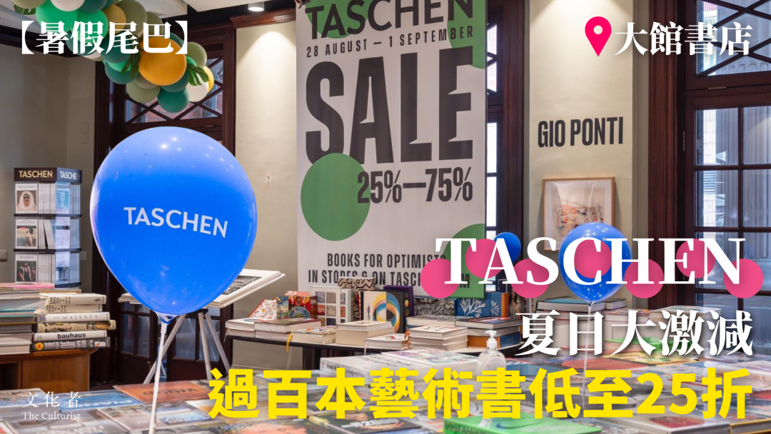 隨着大館一年一度為期三天的「BOOKED 香港藝術書展」本周五正式開鑼,同處大館的藝術書店TASCHEN也率先今天開始,進行夏季忘我大減價,過百本藝術書減價幅度由75折到25折,種類由攝影集、藝術家圖錄、畫冊、印刷品至專題書藉包羅萬有,活動由今日開始至9月1日,機會難逢。
