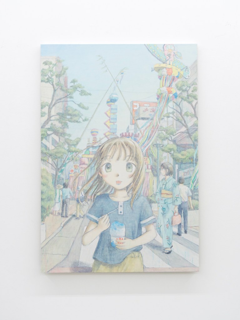 剛開幕的香港個展「少女的時間」,有各種各樣女孩日常生活中的「快照」瞬間:旅行前,年輕女孩提着行李箱;女學生走過城市生活的交匯點;池袋車站現代建築背景前,年輕女孩與她的「想像中的朋友」站在一起⋯⋯倉谷的用色淺淡雅緻,還帶有一種乾顏料(木顏色/粉彩)的獨特風格,但大部份都是布本油畫。其實,她畫水彩用色也相類似。
