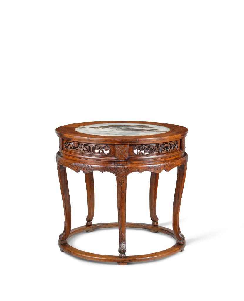 至於這專場的焦點三寶,首任是一件十六世紀末至十七世紀初黃花梨與大理石五足高束腰圓几,為傳世明式家具中最為罕見與稀少的例子。「明朝的桌子都是四方或長方型的,只有香几出現圓型。這香几十分稀有,以我們所知全世界只有兩張,而這張保存得不能再好,桌面鑲嵌的雲石圖案如浮雲,非常特別。」