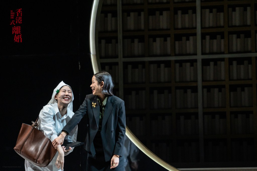 擅寫黑色幽默的黃詠詩,當然不放過在《香港式離婚》植入尖酸與絕核,人情味盎然於無情的幽默中。台上主角銳利的詞鋒,配合兩位律師都傲慢驕矜、剛愎而不甘心處下風的職業病,但兩個挾着稜角的人相處,自然要磨合。不甘示弱、各不相讓,在一段婚姻關係中,會造成怎樣的結果?