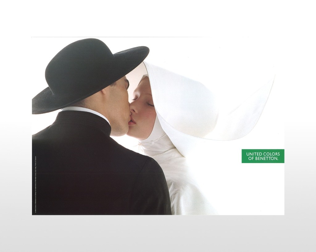 Toscani為 Benetton拍攝最著名,也最「冒犯」的一張作品,是一個黑衣神父,在親吻一個白衣修女,這對保守教徒來說太刺激了。後來市面上出現很多兩大國元首接吻的繪畫(以不可能的禁戀為題材),Toscani是不是這方面的始作俑者?