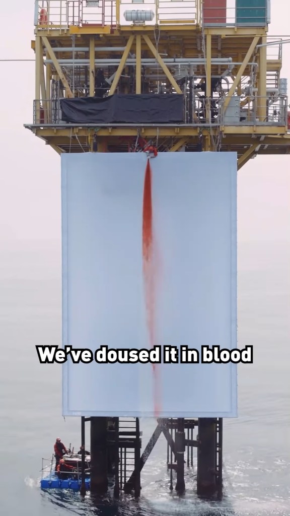 這次,綠色和平與藝術家Anish Kapoor聯手,到達離諾克福(Norfolk)海岸 45 海里外,在天然氣田上,裝上藝術作品《BUTCHERED》(屠殺)。抗議人士共有七名,他們登上海上天然氣平台,安裝了一塊白布,以離海面高 16 米的高壓軟管,將血紅色液體噴射在 12 X 8 米的白布上,場面仿如血祭。血紅色液體其實由海水、紅菜頭粉末、無毒的食品級池塘染料混合而成。綠色和平表示,「這是直接行動遇上藝術的結合(This is direct action meets art)。」