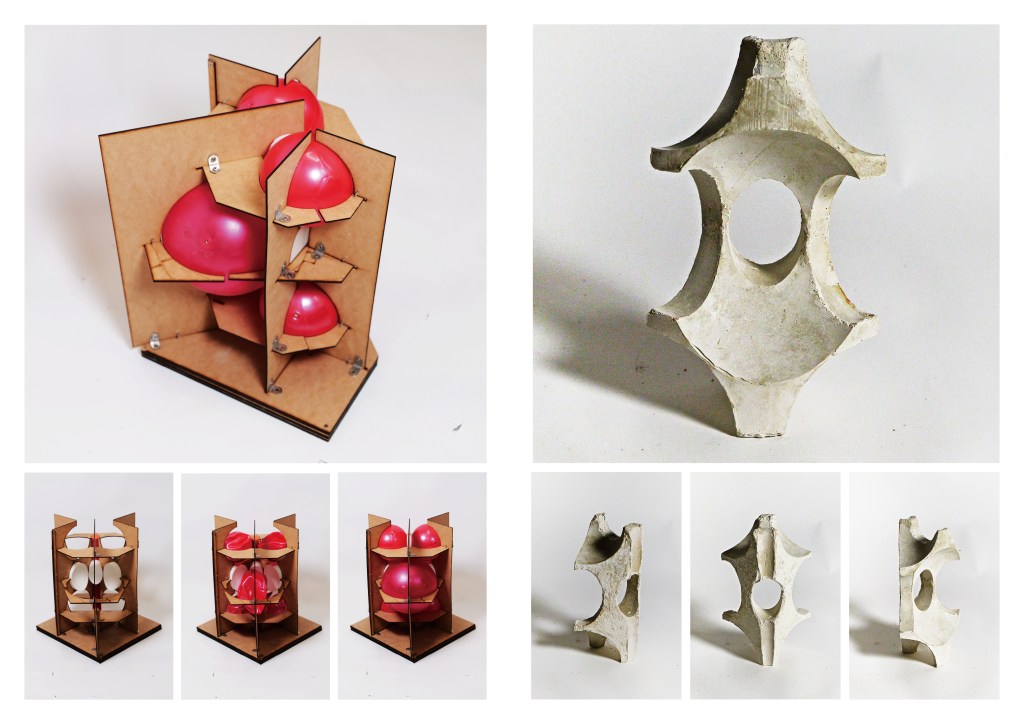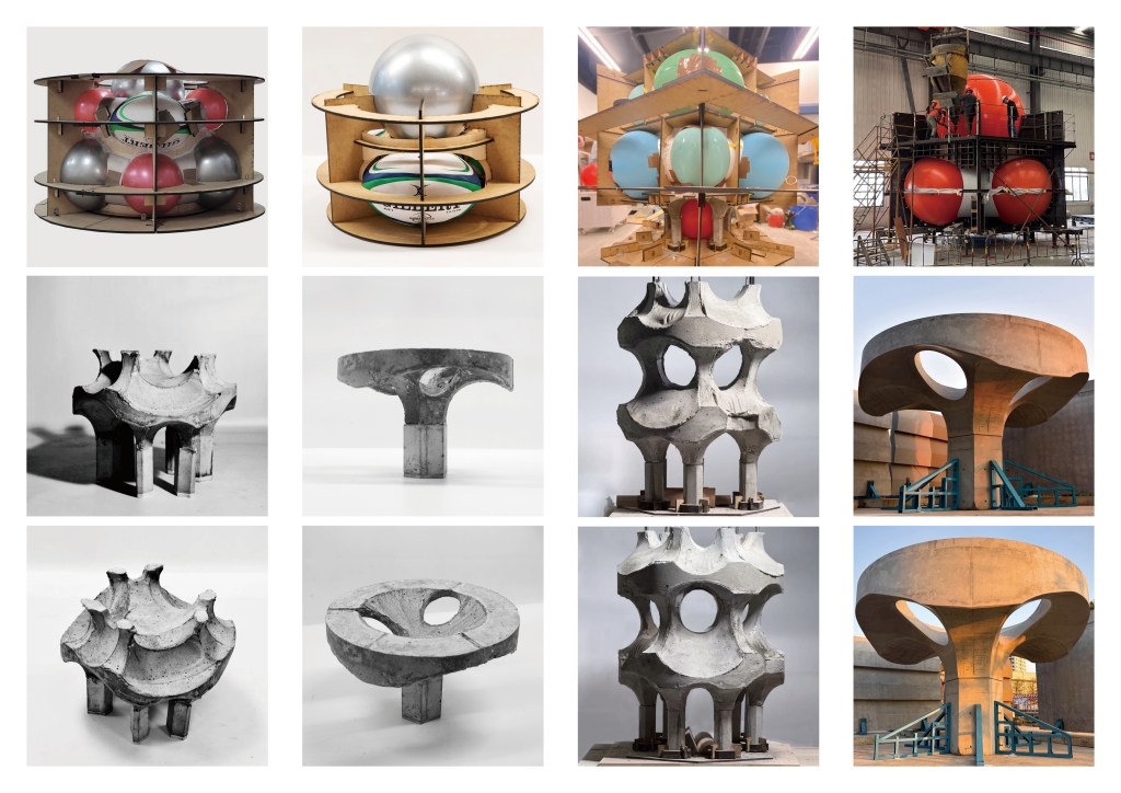 「做設計最讓我興奮的,就是把電腦裏那些看似大膽的研究模型,真正轉化為可觸摸的實體原型。」他由此雀躍地提到,他在香港大學修讀深造建築設計學理科碩士時參與參與名為「Concrete Approximation」三個學期的設計研究工作室,過程中展開一個關於「混凝土形式革新」的研究系列。當中主要探索兩個方向:「一是利用張力(Tension)成型的織物模板,從2D圖像轉化為3D實體,並製作了一系列的混凝土原型;二是我目前的核心研究,即利用主動氣壓(Active Pressure)的充氣模板。」
